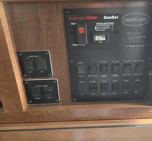 3 slide outs, 2 air conditioners, electric or propane heating, 2 propane tanks, large RV fridge electric or propane operation. large storage underneath, electric awning, automatic leveling, electric water heater, 2 televisions, big island with double stainless steel sinks, convection microwave, propane oven and cooktop, couch, table chairs, stereo, queen bed with underneath storage, very large closet with cabinet and drawers, washer dryer hookups.